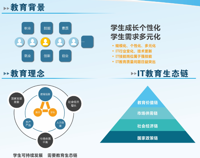為改善這種現狀,非常需要學校與企業共同教育的模式,在聯合教學上,厚溥做得非常好。與接觸到的其他培訓機構相比,厚溥團隊對于教育的領悟更深入,本質領會更到位。厚溥資源豐富,但更重要的是內容、方法、管理三個方面,學校可以通過購買優質服務來提升自己辦學水平。
