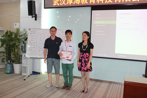 最后階段,評委們進行了認真細致的評定,J1414班的管勇獲得了一等獎,獎金為500元;J1415班的何旦獲得了二等獎,獎品為聯(lián)想藍牙耳機;J1418班的羅祖雨獲得了三等獎,獎品為倍斯特移動電源。J1413班的卞文聰、黃中舉獲得了優(yōu)秀獎,并為他們頒發(fā)了榮譽證書。厚溥實訓(xùn)中心夏小山老師獲得了優(yōu)秀指導(dǎo)老師獎,;實訓(xùn)中心盧歡老師獲得了優(yōu)秀指導(dǎo)督導(dǎo)獎。
