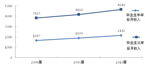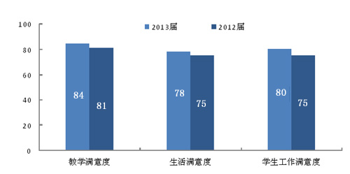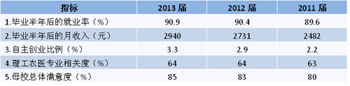 報告顯示,畢業(yè)生就業(yè)率持續(xù)上升,2013屆畢業(yè)生半年后的就業(yè)率為90.9%,比2012屆上升0.5個百分點。月收入持續(xù)增長,“跑贏”通貨膨脹,2013屆畢業(yè)生半年后月收入為2940元,比2012屆增長7.7%。自主創(chuàng)業(yè)比例為3.3%,比兩年前的2.2%提高了50%。畢業(yè)生專業(yè)相關(guān)度為64%,與前兩年基本持平。畢業(yè)生對母校的滿意度持續(xù)上升,2013屆的滿意度為85%,比2012屆上升2個百分點。(見表1)