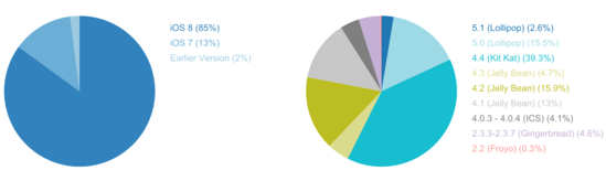盡管越來(lái)越多的制造商對(duì)軟件開(kāi)發(fā)者來(lái)說(shuō)可能不是好事,但對(duì)碎片化的抱怨日益消失是有原因的。安卓用戶(hù)逐漸集中在幾個(gè)最近發(fā)布的系統(tǒng)版本上,57%的設(shè)備在運(yùn)行KitKat或更新的版本。91%的設(shè)備運(yùn)行Jelly Bean或更新的系統(tǒng)。但和iOS的狀況比起來(lái),安卓的成績(jī)就不算很好了。最新的iOS 8系統(tǒng)運(yùn)行在超過(guò)85%的設(shè)備上。