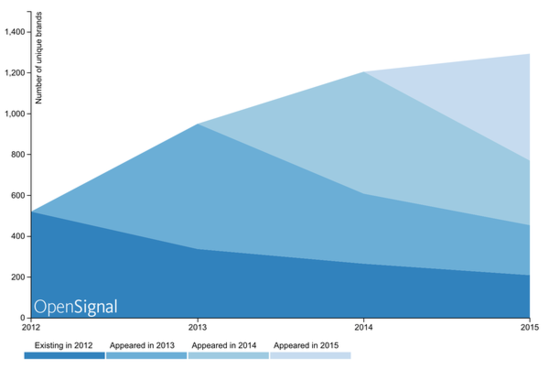 圖中最大的變化不是三星的主要競(jìng)爭(zhēng)對(duì)手?jǐn)U展了多少份額,而是上百家小型廠商的出現(xiàn)。OpenSignal表示發(fā)現(xiàn)了1294家獨(dú)立生產(chǎn)商,其中超過(guò)1000家在2012年的時(shí)候還根本不存在。值得注意的是,一些2012年還存在的廠商現(xiàn)在已經(jīng)消失了,所以我們看到的增幅或許沒(méi)有那么大。